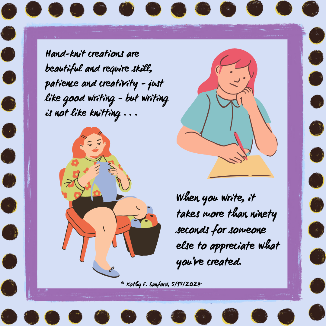 I will never part with all the gorgeous hand-knit scarves, sweaters, etc., I've been so generously gifted by my friends who knit and that I will appreciate for a lifetime (not just 90 seconds). But I do often think about this. If writing is my "craft" like knitting or sewing or painting or drawing or sculpting or modeling or building or whatever else might be yours, I understand I am asking more time and effort of you when I show you my work. I thank you from the bottom of my heart for reading.